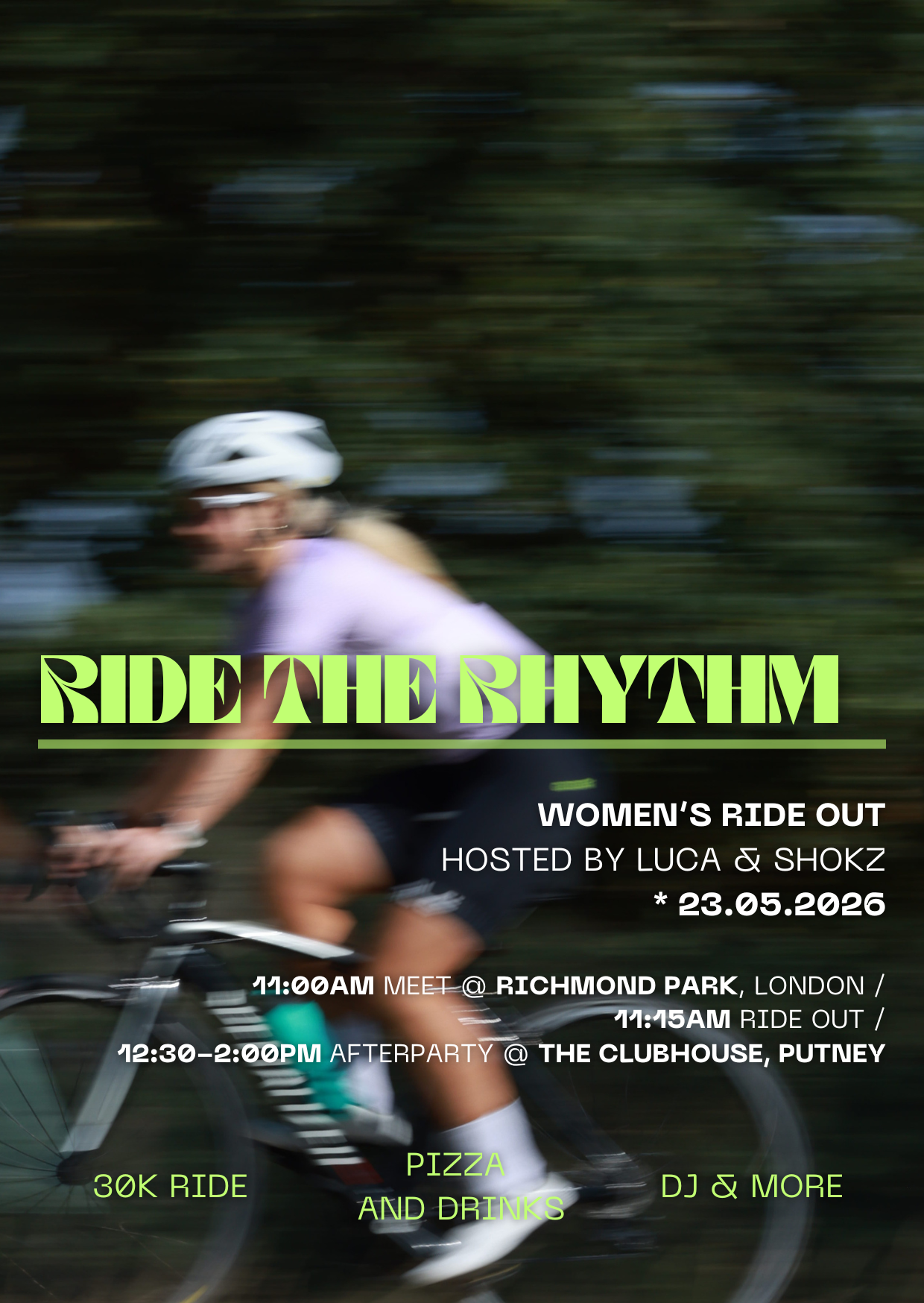On 23rd May, join an inspiring community of female riders for a 30KM guided journey through the stunning Richmond Park. Led by LUCA founder Luca Kuhn and SHOKZ ambassador Katie Kookaburra, alongside an expert team of ride leaders, this is more than just a ride, it’s a celebration of confidence, connection, and freedom on two wheels.